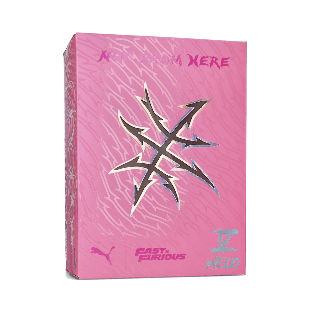 La parte superior está confeccionada con un tejido de malla técnica. En el talón, cuenta con un detallado relieve de alambre de púas moldeado, inspirado en los tatuajes de Melo.